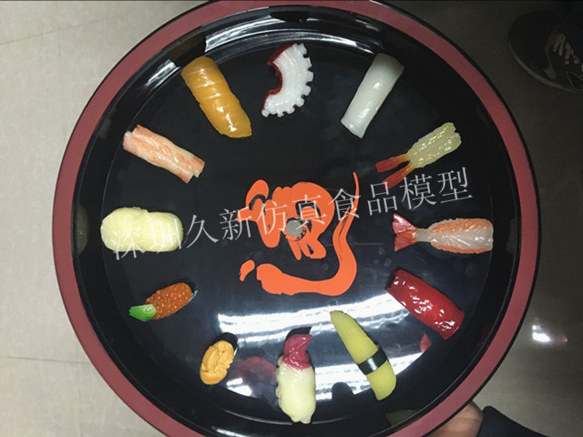 比如上图中的寿司,仿真寿司模型,把它做成一个钟高高悬挂起来,从形象上也大大的刺激了吃货们的欲望,有一点望梅止喝的效果,让食品模型更加完美更具艺术性,从而保持食品原有的“型、色、艺,的最挂状态,以精湛工艺水平,鲜艳饱满的视觉冲击力,刺激食客味觉,达成消费明档展示取代真正食品展示的最佳效果,既环保又节能,不管你来或不来食品模型都一如既往的优美的等着您。